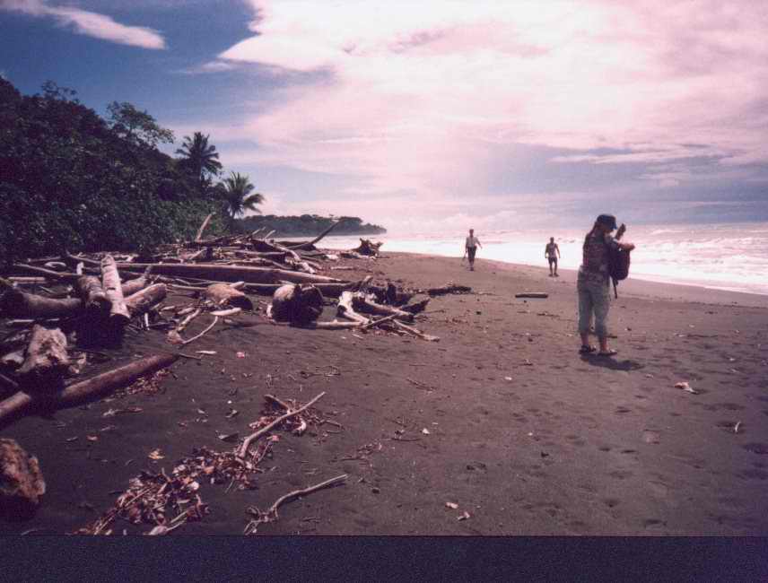 Here we were taking a lunch break during the 8 hour backpack along the ocean to the ranger station outpost, and the first night's lodging up in the rafters over the ranger station. It started raining late in the afternoon, so we said "...to heck hiking another hour to get to dinner at the ranger station...". We set up camp and lit a nice campfire. We struggled to keep it going for almost an hour in the warm rain, just long enough to cook dinner. Early the next morning the monkeys came out of the trees to pick up the fruits and flowers that the heavy rains had knocked out of the trees overnight! They were looking at our tent and wondering what it was!