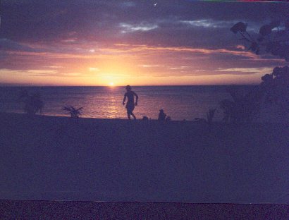 The best part about Roatan is the beach at West End. It was without a doubt the most awesome beach I've ever been at, and I've seen quite a few (hundreds, including almost all of the coastline of North- and Central America). We had to walk along a trail for about 35 minutes along the water, or take a water taxi for about a dollar. The beach was the most beautiful white sand, and coconut palms everywhere. I had just spent a few months along the coasts of Costa Rica, Belize, etc., but the West End beach at Roatan was a one-in-a-thousand. Only 50 meters out was a reef, and we all snorkeled for three or four hours everyday. For several days the Cousteau boat (Jacque's son) anchored offshore, and we would go out snorkel out to and dive down the 50 feet or so to tap the tanks of the divers, and glance at their depth gage before heading up to the surface. The beach faced west, so we watched beautiful sunsets every night.